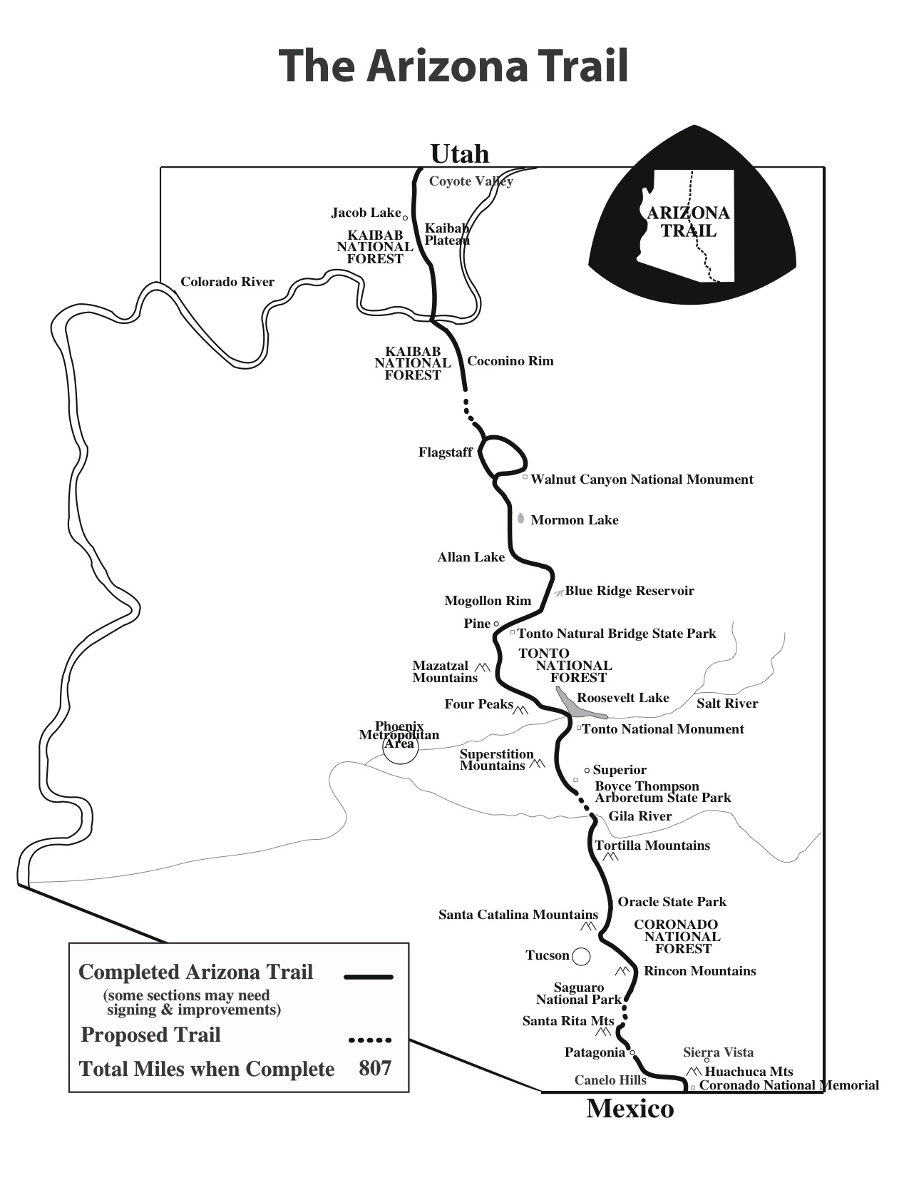 The Arizona Trail is an 800+ mile recreation trail from Mexico to Utah that connects mountain ranges, canyons, deserts, forests, wilderness areas, historic sites, trail systems, points of interest, communities, and people. It serves dayhikers, backpackers, equestrians, mountain bicyclists, trail runners, nature enthusiasts, cross-country skiers, snowshoers, and mule and llama packers.