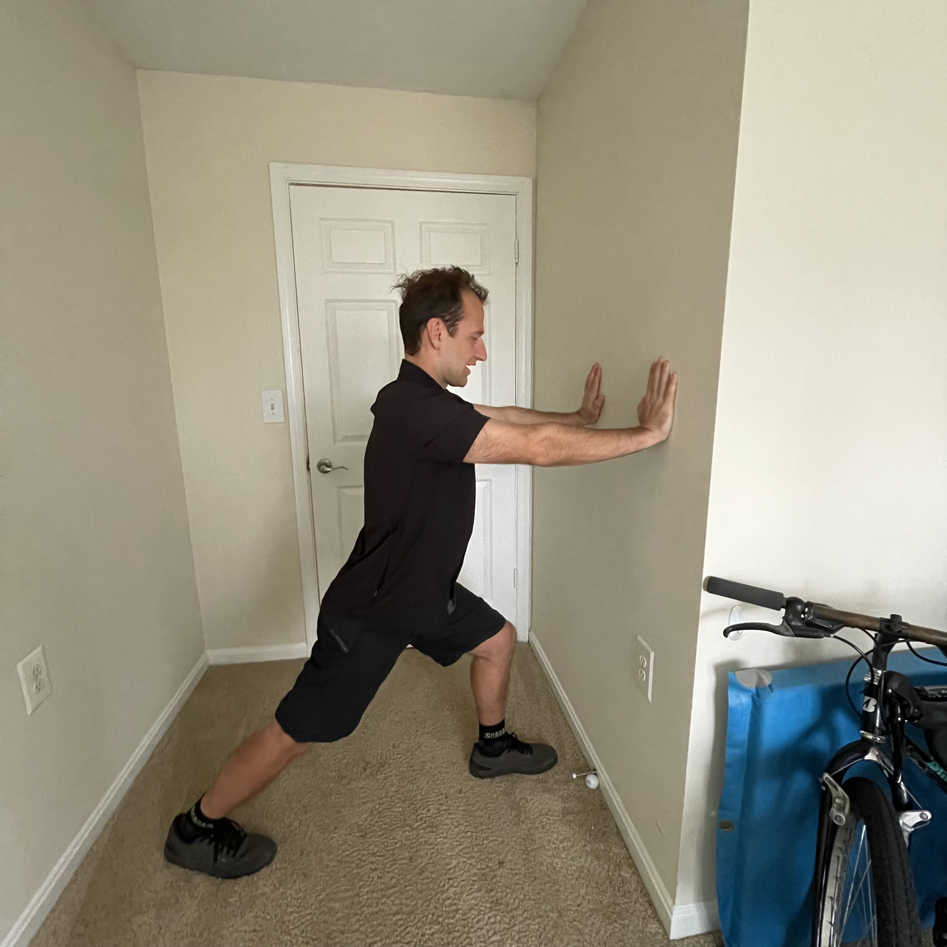 Slowly lean forward over your front leg, keep your back knee straight, and your heel flat on the floor. You should feel this stretch in your calf. Hold for a few seconds on each side then switch.