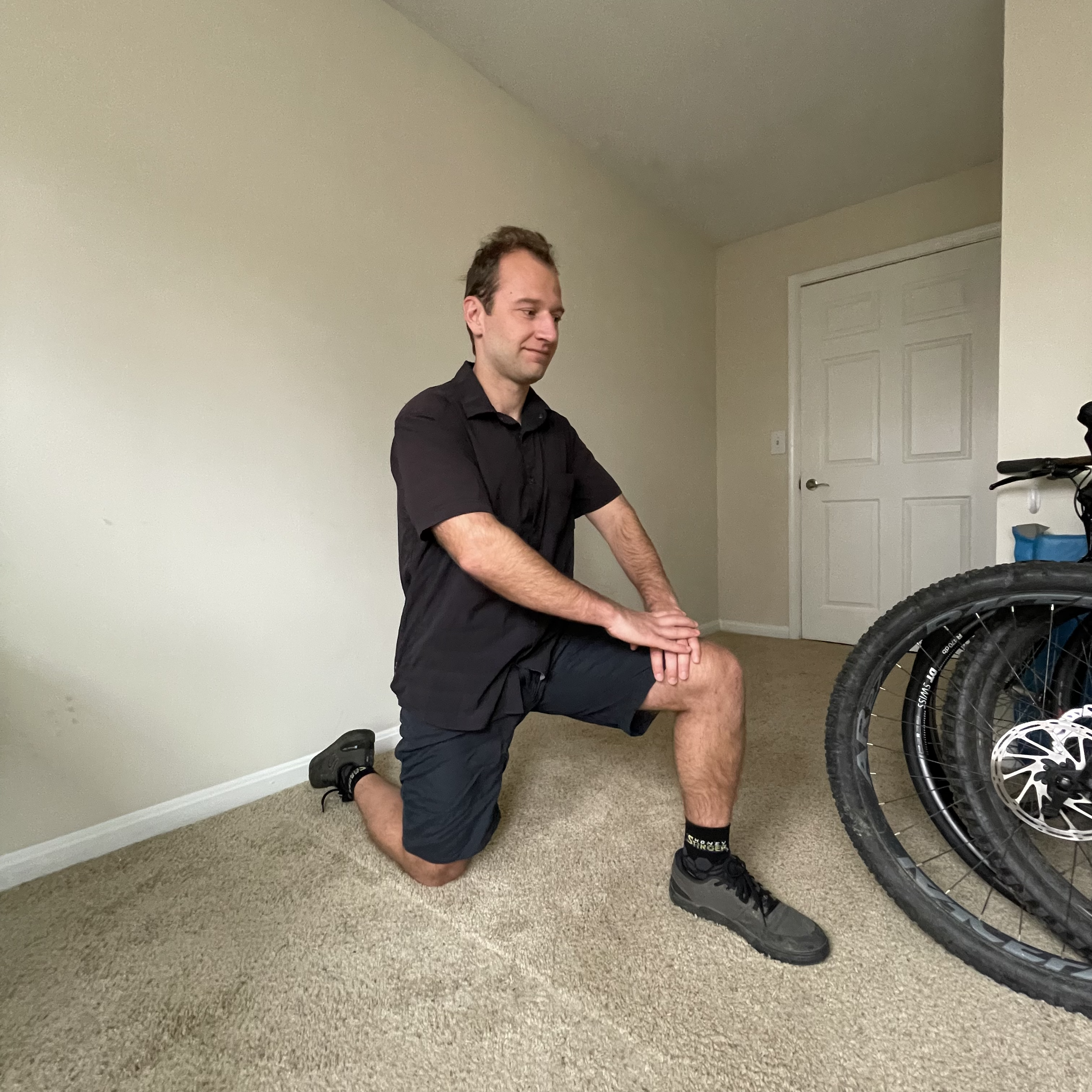 This quad stretch is a great way to undo hours of being hunched over on your bicycle. This stretch will help open up your quad muscles, hips, chest, and shoulders. Start by taking a knee on your right leg and leaning into your right hip. To increase the intensity of the stretch in your quad, you can lift your back foot or prop it against a wall. Make sure to breathe and ease into this stretch as your quad muscles loosen up.