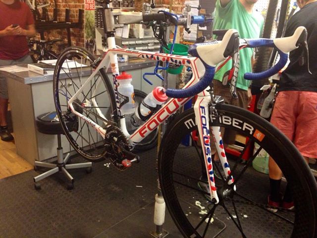 We had some pretty fast visitors to the Peak Cycles Bicycle shop the other day. None other than Team Jelly Belly! Pro rider Freddie Rodriguez got to see one of his old kits hanging from the shop ceiling! And better yet, our shop mechanics got a chance to work on Freddie Rodriguez’s Stars and Stripes bike!